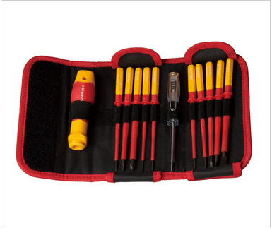 3件-一字双色绝缘螺丝批2.5x75,4.0x100,5.5x125mm 2件-十字双色绝缘螺丝批#1x80,#2x100mm 4件-VDE绝缘钢丝钳6“ 绝缘尖嘴钳8“ 绝缘斜嘴钳6“ 绝缘 1件 - 胶带红色 1件-VDE测电笔145mm。