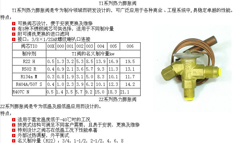 1 拼装式结构使修理方便 2.外部的过热调整 3.可互换和置换的阀笼使热力膨胀阀更具有通用性(1/4至100冷吨制冷量) 4 可互换的阀体法兰为您提供所需要的任何接头 5.可互换的动力元件使阀体具有长的寿命 6.有适合各种用途的多种充注