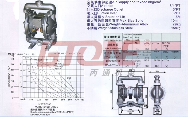 ■技术参数: 1最大空气供应量:8KG/cm2 2材质:铝合金、不锈钢 3空气入口:3/4''PT 4吐入口:3''PT 5吸入口:3''PT 6吸入扬程水:6m 7最大输送固体粒直径:Ø 10 mm